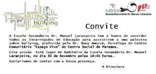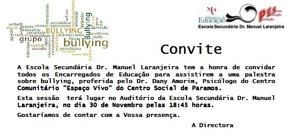 Durante as primeiras semanas do 2º Período, as turmas do 8º ano de escolaridade tiveram a oportunidade de assistir a uma sessão de sensibilização sobre o fenómeno Bullying. Estas sessões contaram com a colaboração do Dr. Dany Amorim, Psicólogo do Centro Social de Paramos. Em cada sessão os alunos puderam reflectir e discutir sobre os tipos de Bullying (verbal, físico, emocional e cyberbullying) e compreender que o Bullying é um comportamento de violência física, verbal ou psicológica, intencional, repetido e com desequilíbrio de poder (físico, idade, intelectual, psicológico) entre agressor e vítima. Concluiu-se que o principal factor de risco centra-se numa característica física diferente do padrão normativo (cor da pele, obesidade, cor do cabelo, …).